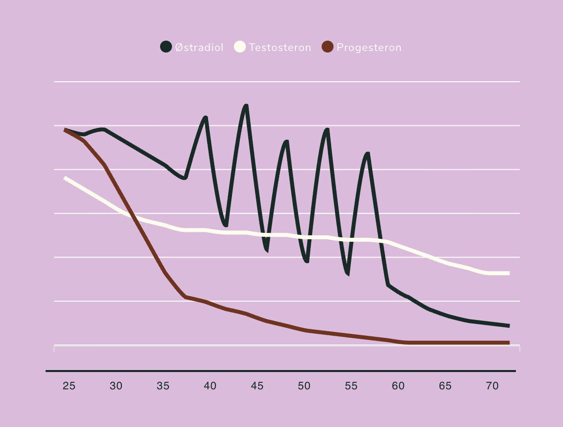 Grafen viser, hvordan kvinders hormonniveauer ændrer sig med alderen. Østradiol fluktuerer voldsomt i årene op til menopausen, før det falder til et stabilt lavt niveau. Progesteron falder tidligt og kraftigt, mens testosteron gradvist aftager mere jævnt gennem livet.